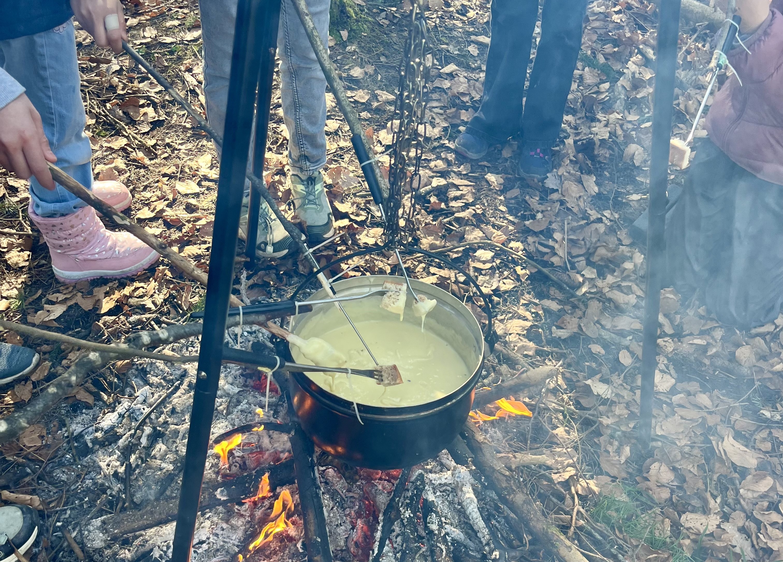 Wir gingen mit unseren Lehrpersonen, Herr Angst und Frau Lusi, in den Wald oberhalb des Schulhauses. Wir hatten eine grosse Pfanne, ein Gestell und Fonduegabeln dabei. Ein paar Kinder hatten auch Würste eingebackt, weil sie Fondue nicht mögen.